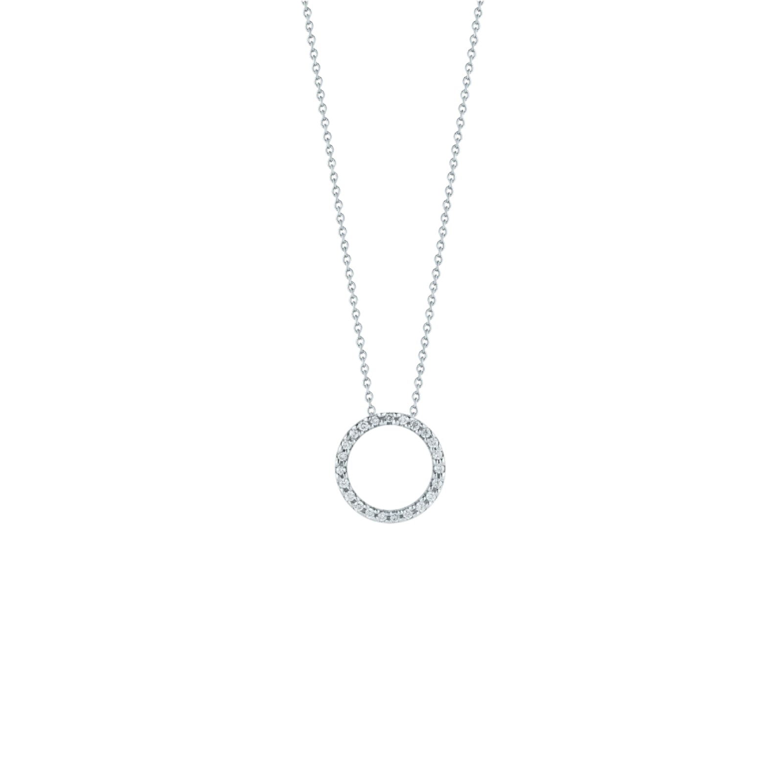 This X-Small Circle Pendant is crafted from 18K White Gold and features 0.10ct Round Diamonds. Pendant includes chain that measures 18in.