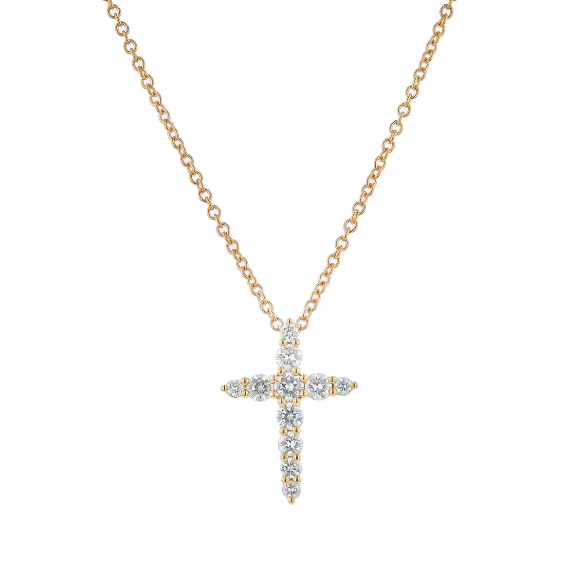 0.36–0.42ct graduated diamonds set in a cross pendant on chain crafted in 18K yellow gold, 18 inch.