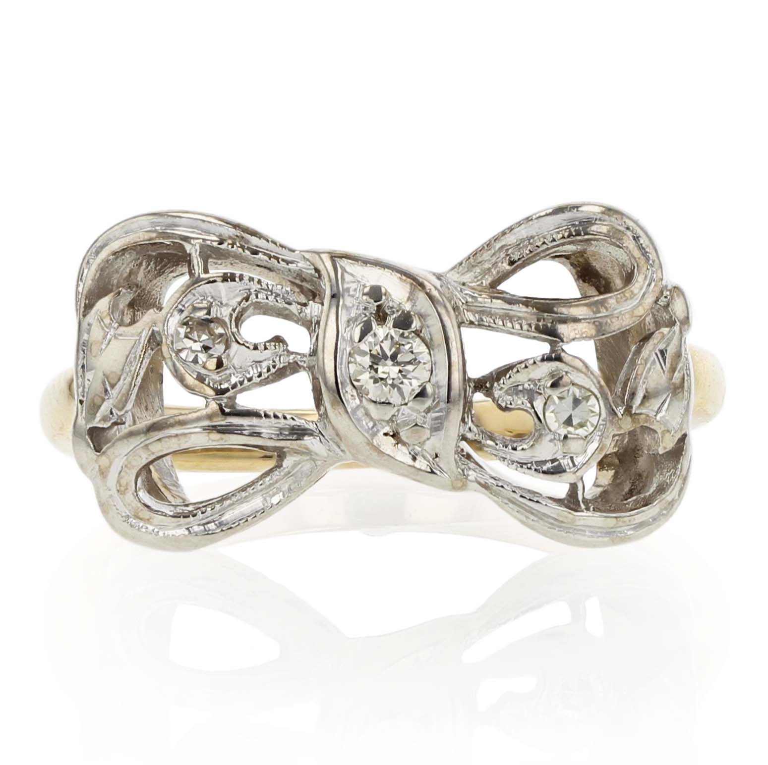 Bow ring with a 0.10ct single cut diamond, crafted in 14K white and yellow gold.