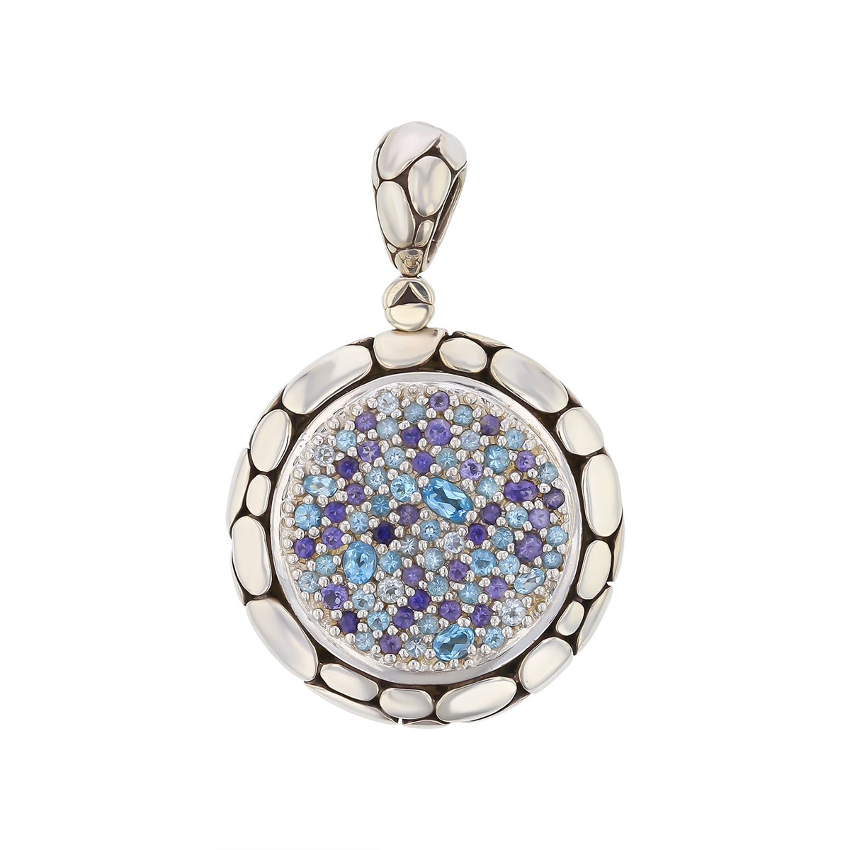 John Hardy Kali Iolite and Blue Topaz Disk Pendant. This luxurious pendant, crafted in sterling silver, features stunning iolite and blue topaz gemstones in a unique disk design. Perfect for adding a touch of elegance to any outfit.
