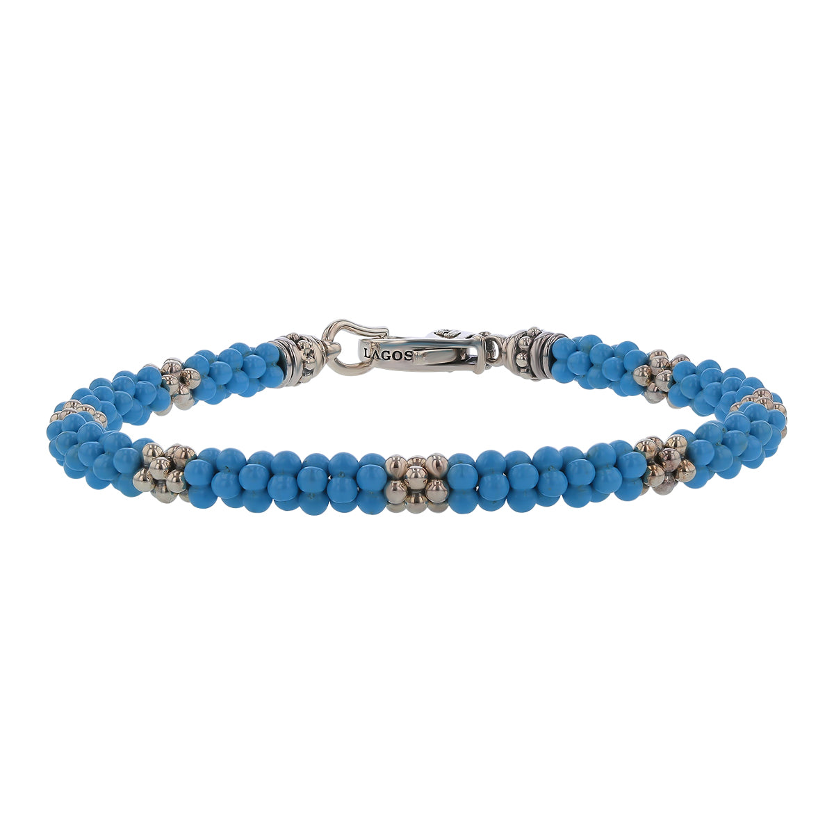 Lagos 5mm Station Bracelet. This stunning piece features a unique combination of blue ceramic and sterling silver, creating a modern and elegant look. With a 7" length, it's the perfect accessory to add a pop of color to any outfit.