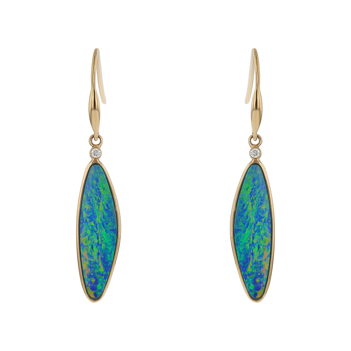 These Opal Doublet and Diamond Drop Earrings are crafted in 14K Yellow Gold, perfect for any occasion.