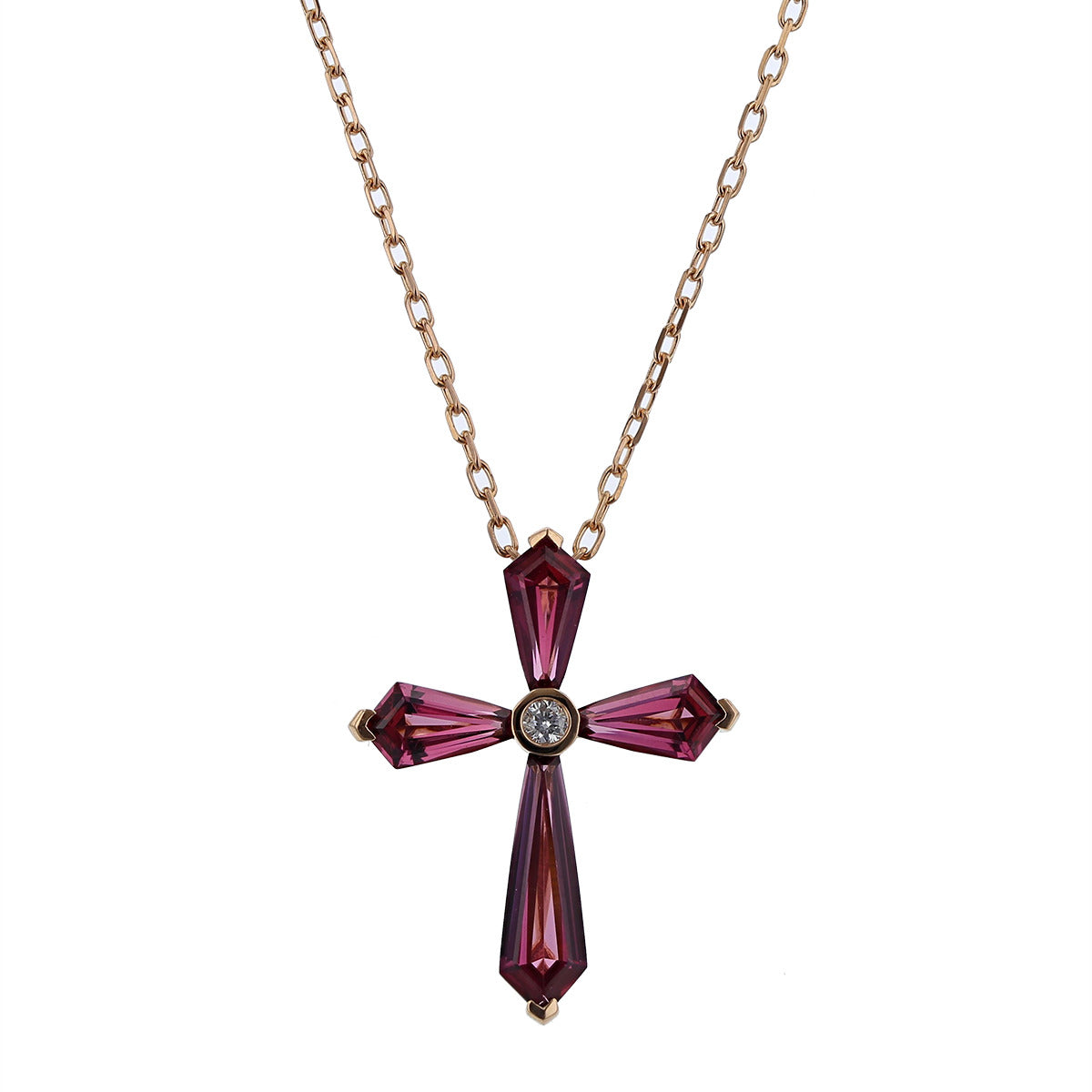 This Pink Garnet and Diamond Cross Pendant Necklace features a Primary Material of 18k Rose Gold and a Primary Gemstone, as well as a Secondary Gemstone of Diamond. The Primary Color is Pink with a Secondary Color of G-H. The Total Carat Weight is 1.43.