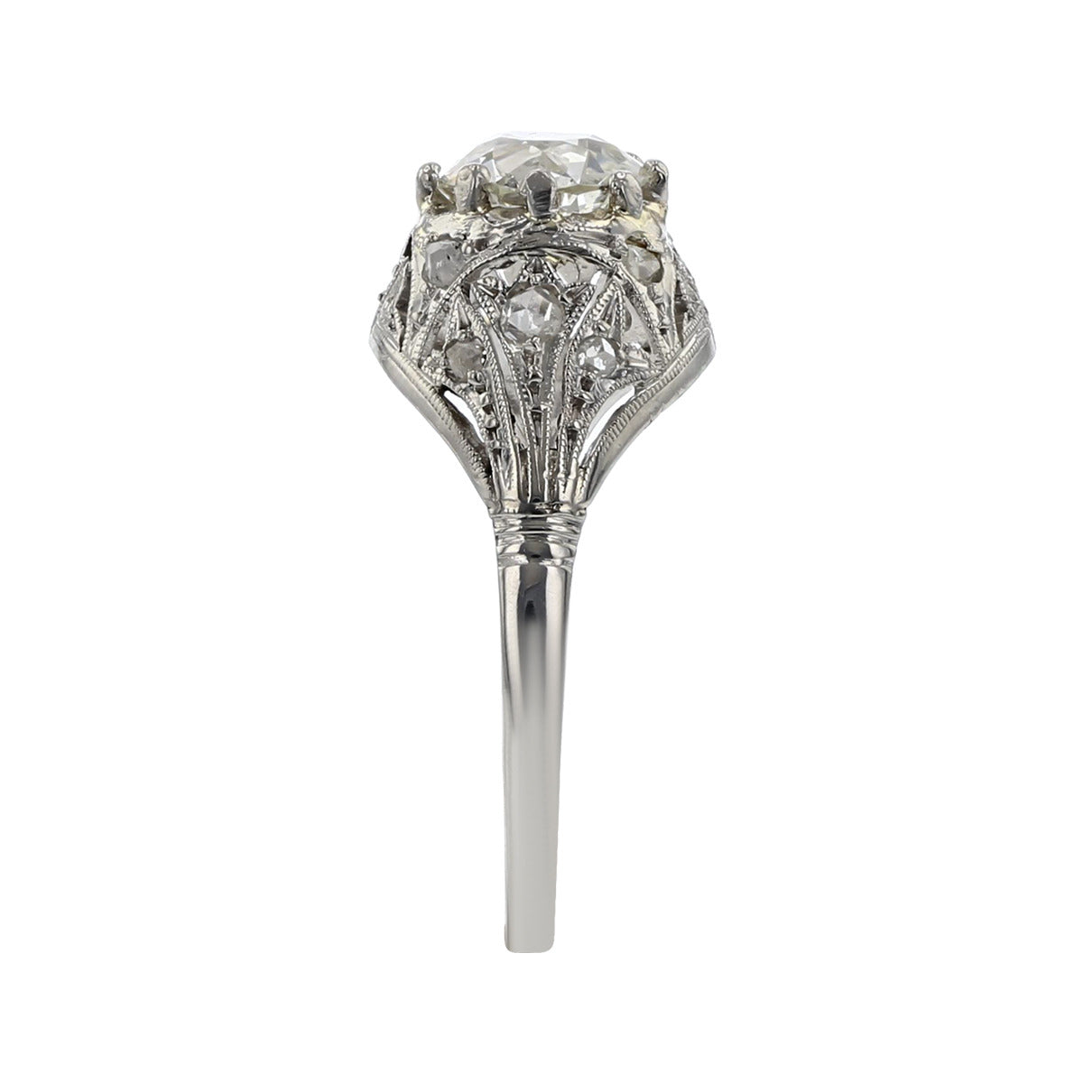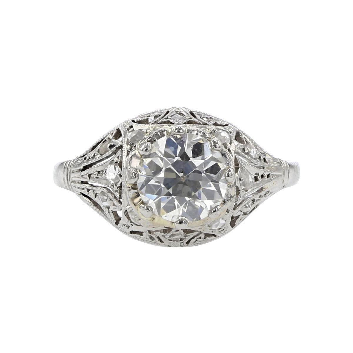 This engagement ring is crafted from platinum, featuring a stunning old European-cut diamond with a total carat weight of 1.02. It is from the J Collection and has a modern design.
