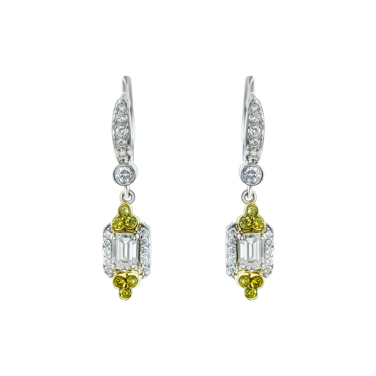 Crafted from platinum and 18k yellow gold and adorned with diamonds in shades of E, G-H, and E, these Precious Pastel Diamond Drop Earrings boast an impressive total carat weight of 1.27.
