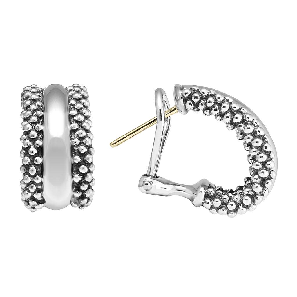 Signature Caviar Hoop Earrings. Crafted with sterling silver, these statement hoops add a touch of elegance to any outfit. The intricate caviar detailing creates a unique texture, making these earrings a must-have for any fashion-forward individual.