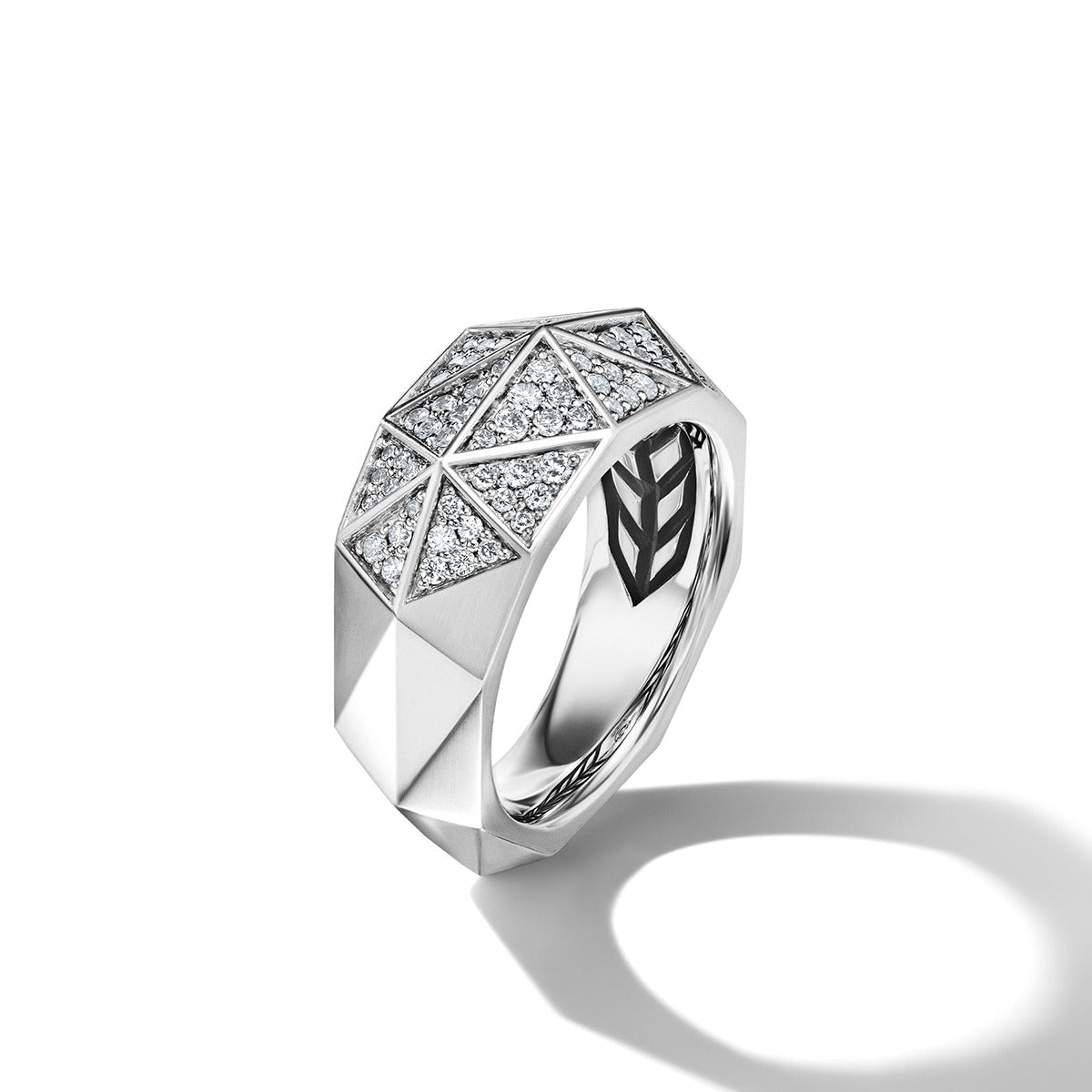 This ring is crafted from sterling silver and features a faceted design, adorned with pave diamonds totaling 0.91 carats. The primary material is high-quality sterling silver and the primary gemstone is exquisite diamonds.